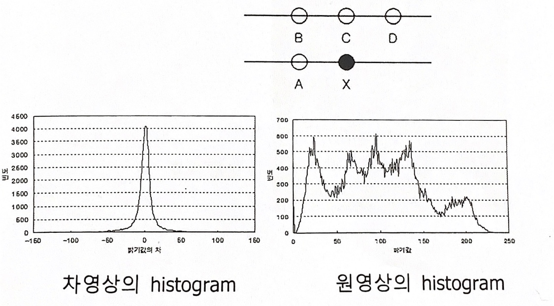 | 문제 1. Grayscale Lenna에서 차분값 Δ = X - (A+C)/2을 구한 후에 차영상 버퍼에 저장 2. 차영상의 histogram을 구하세요. Δ는 음수값이 나오므로 +128을 더해서 처리해보자.